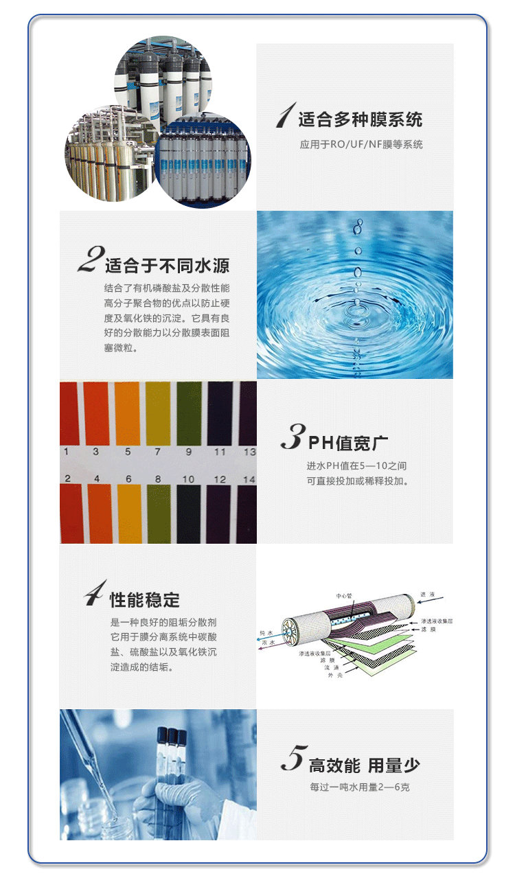 加药量:所需要的加药量根据个别装置操作条件确定,要根据进水盐度、温度、回收率、反渗透膜种类等条件而计算出一个合适的加药量,推荐加药量为2-5PPM。